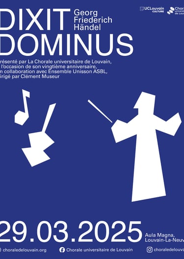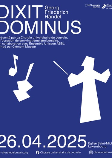 Twentieth anniversary of the Louvain-La-Neuve University Choir. Dixit Dominus Handel. Excerpts from Handel's Messiah performed by the Louvain-La-Neuve University Choir accompanied by a string orchestra from the Ensemble Unisson ASBL.
